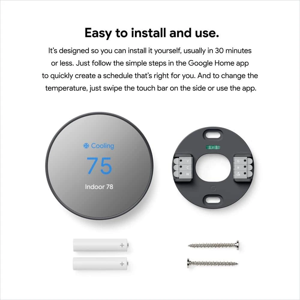 Control the temperature in your house with the Nest Thermostat. You can install it yourself in 30 minutes or less. Operate it from anywhere using the Google Home app. For convenience, it tracks temperatures and shuts itself off when you leave.