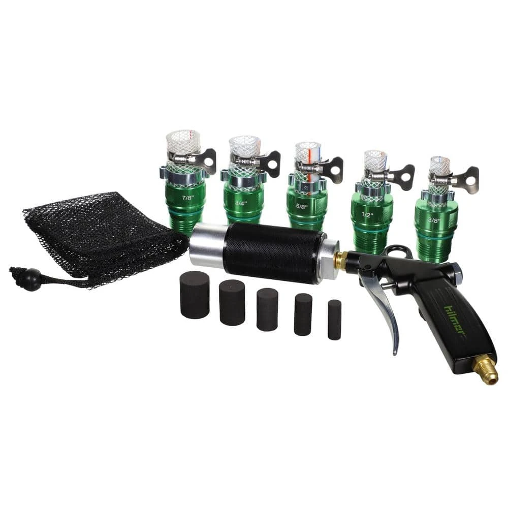 The Hilmor line set cleaner uses a pressurized source to launch the carefully selected specialized foam puck into the line set that effectively wipes the pipe clean of all contaminants and remaining refrigerants. Ideal for cleaning line sets after compressor burnout. Can be used with or without solvent flush for A2L compliant system changes and refrigerant transitions. Just pick the nozzle that fits your lineset, connect the pressure tank (not included), and shoot the foam pick down the line.
