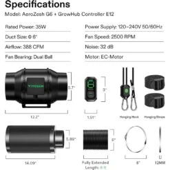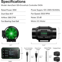 AeroZesh G6 6 In. 388 CFM Inline Duct Fan With GrowHub E42A Temperature Humidity WiFi-Controller