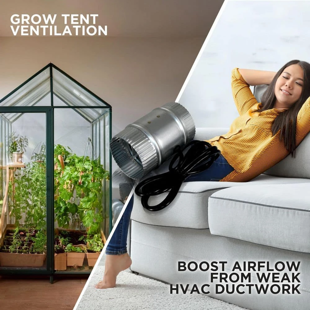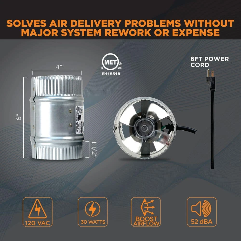 The Inductor 4 in. Corded In-Line Duct Fan is engineered to overcome back pressure and boost air in forced air heating and cooling systems without upsetting the balance in the closed loop system. The DB204C boosts airflow in ducts with low air delivery to improve comfort and energy efficiency. If you have rooms that are too hot or too cold due to poor airflow, this is an efficient and economical solution.