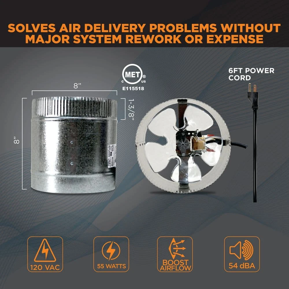 The Inductor 8 in. Corded In-Line Duct Fan is engineered to overcome back pressure and boost air in forced air heating and cooling systems without upsetting the balance in the closed loop system. The DB208C boosts airflow in ducts with low air delivery to improve comfort and energy efficiency. If you have rooms that are too hot or too cold due to poor airflow, this is an efficient and economical solution.