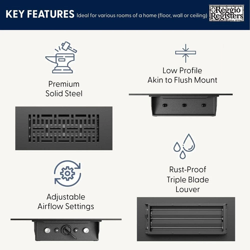 The ‘Low Profile’ series from Reggio Register are designed to deliver superior product performance, both above and below the surface. Above the surface, the vent cover thickness is 14-gauge premium steel to emulate a flush mounted floor register. Below the surface, the attached louver is optimally engineered 1 to be rust-proof, 2 to feature 10 airflow settings, 3 to hide silver ductwork with a triple-blade black design, and 4 to locate the airflow control knob under the vent cover surface to remove the risk for the airflow to be adjusted by accident. Available in 4 in. x 10 in.