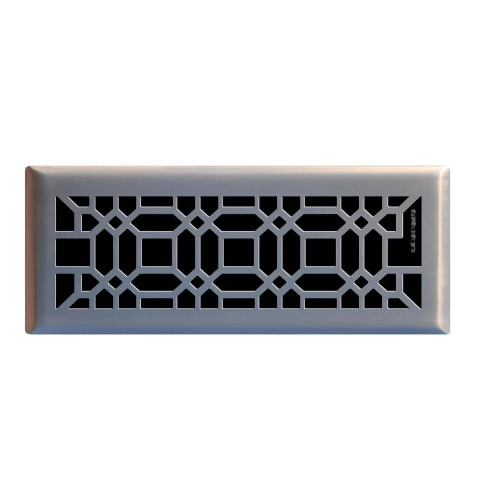 The Hampton Bay E1403-BN 4 in. x 12 in. Oriental Floor Register features high quality steel with a 1-way air diffuser. The smooth glide technology ensures rattle-free and quiet air flow from your central air system, while providing easy opening and closing of the back dampers. A brushed nickel finish offers a stylish, contemporary flair complete with an oriental design.