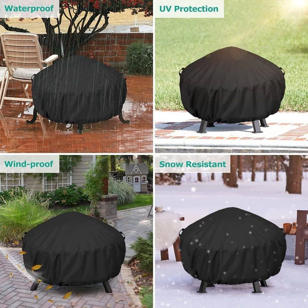 - Black 420D PU coated round fire pit cover, the fabric is thick, wear-resistant and tear-resistant, the PU layer is waterproof, outdoor rain does not seep through, the sun does not age, effectively insulating dust, giving long-lasting protection to the fire pit.