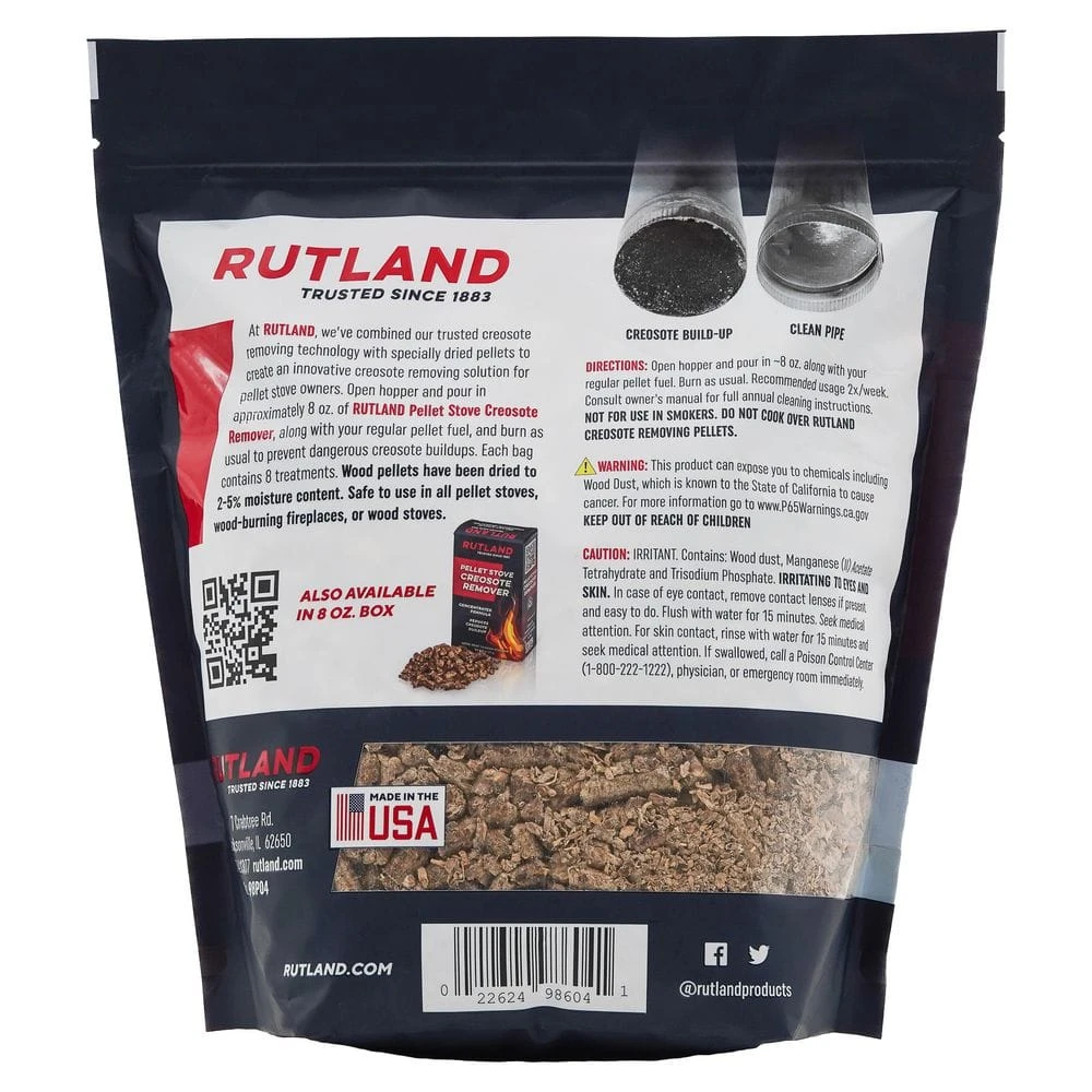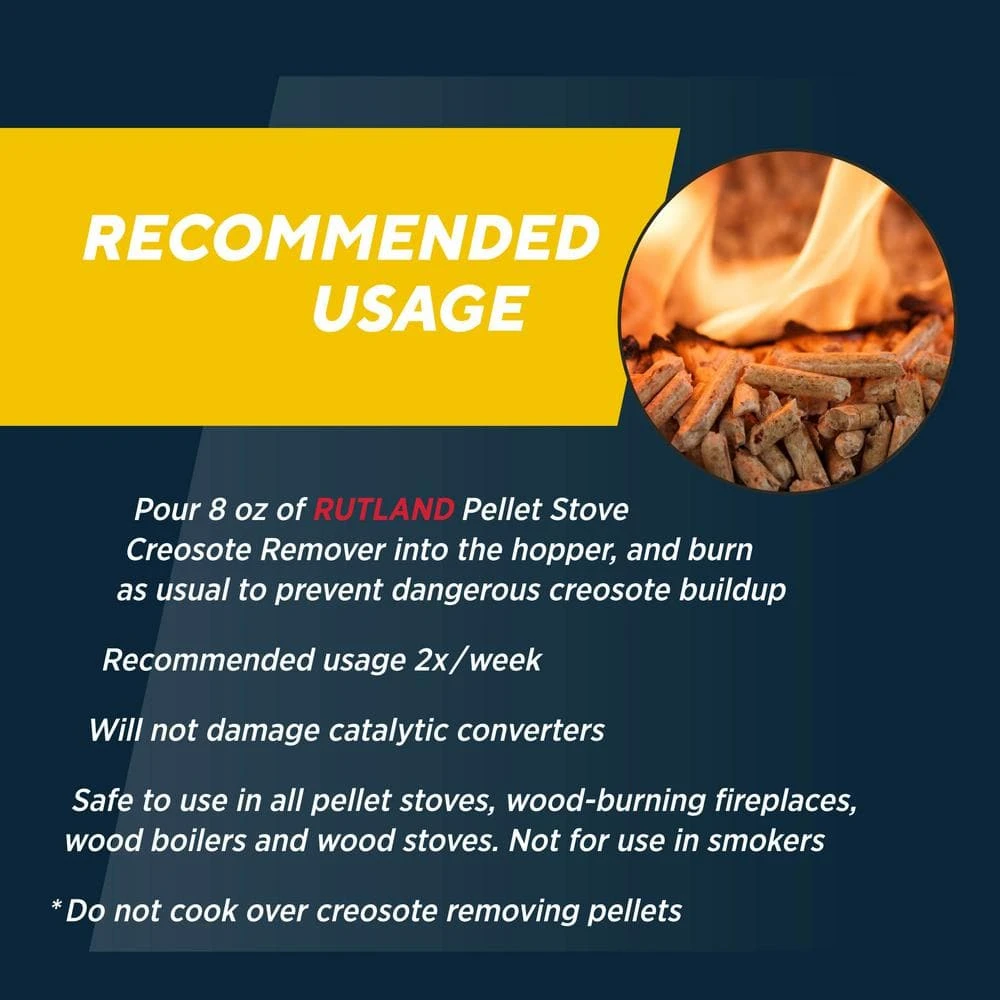 At Rutland, we’ve combined our trusted creosote removing technology with specially dried pellets to create an innovative creosote removing solution for pellet stove owners. Open hopper and pour in approximately 8 oz. of Rutland Pellet Stove Creosote Remover, along with your regular pellet fuel, and burn as usual to prevent dangerous creosote buildups. Each 4 lbs. bag contains 8 treatments. Wood pellets have been dried to 2-5% moisture content. Safe to use in all pellet stoves, wood-burning fireplaces, or wood stoves. Not for use in smokers. Do not cook over Rutland Creosote Removing Pellets.