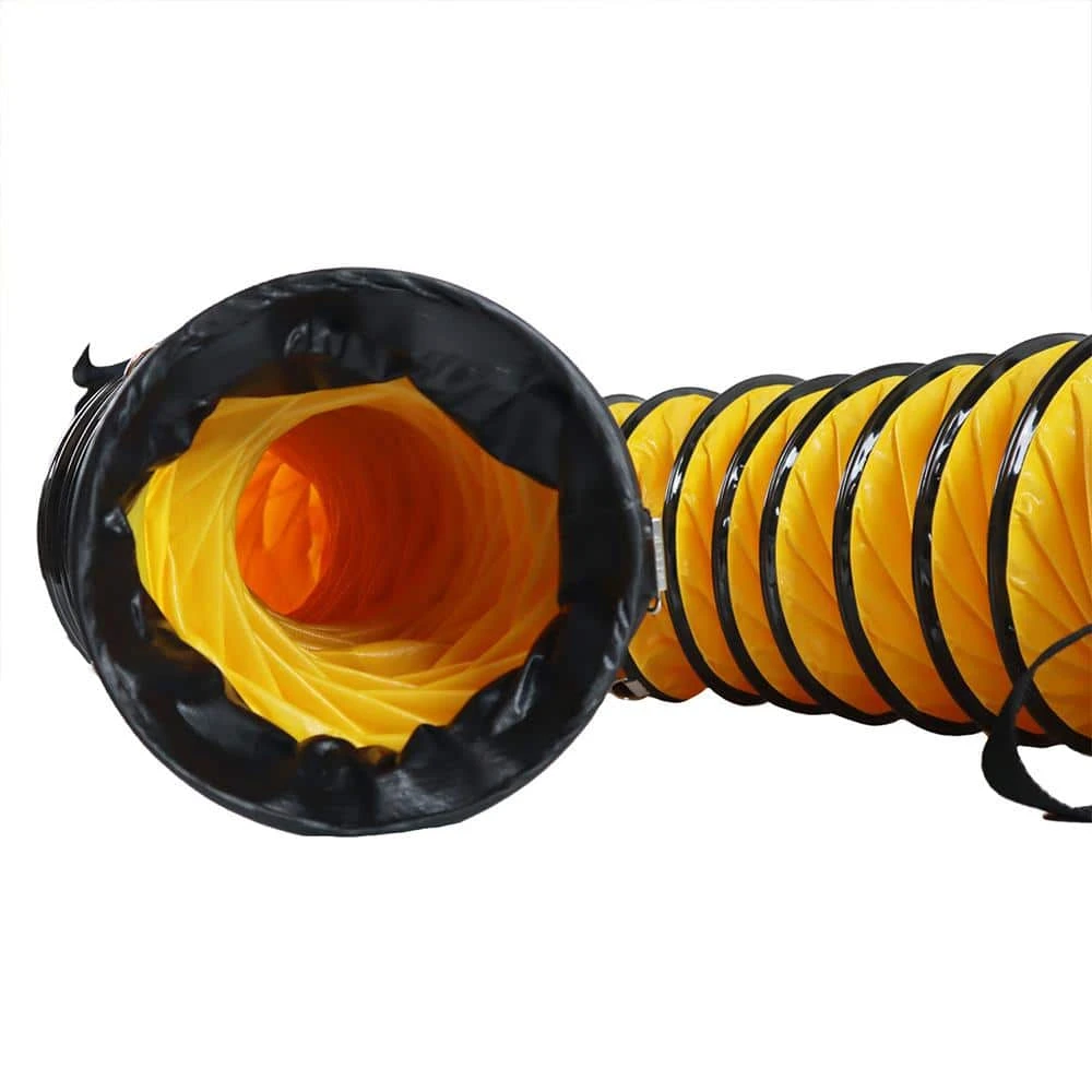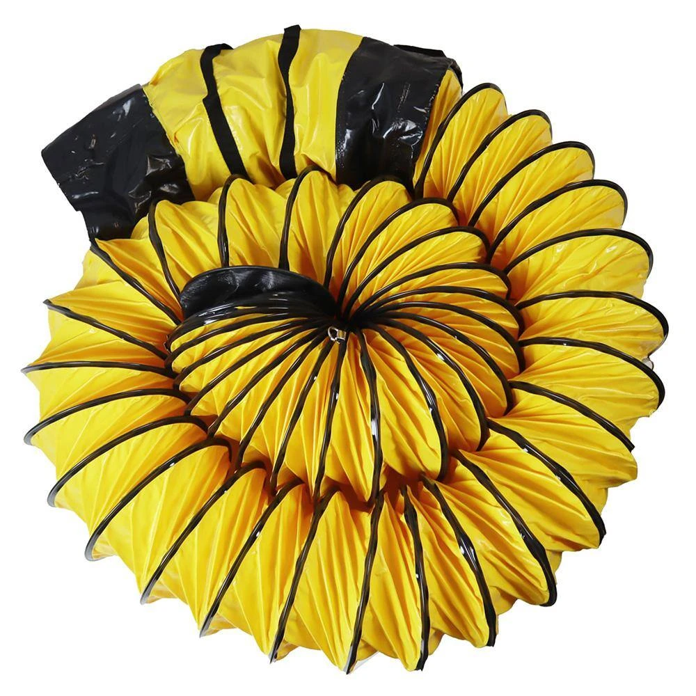 The Porta-Duct is a portable hose that is built within a transportable carrying bag The wear strip protects the flex duct from scrapes that the hose may experience when moved in exterior spaces. The Porta-Duct is a portable air conditioning hose. This duct is designed to work in ambient temperatures and is rated at -20°F to +165° F. The Porta-Duct is available in 25 ft. lengths and in popular ID (inside diameter) sizes which are: 6, 8, 10, 12, 14, 16, 18, and 24 in. The 2 ends of the hose are finished, one with an enclosed belted cuff and the other end with an enclosed nylon ring. The Porta-Duct has a built-in sack with handles for easy transportation. This hose has a 10-to-1 compression ratio which results in a highly compressible and flexible duct that can maneuver around equipment and permanent structures with ease. This flexible duct is made from a PVC vinyl laminated polyester fabric. The PVC coated polyester fabric is then reinforced with a steel wire helix and then an external wear strip is added to the protrusions that are caused by the wire. The PVC coated fabric wall contains chlorine and fluorine, which are known for their stability. This chemical stability enables flexible PVC to be resistant to stressors like flame, chemicals, and oil. The Porta-Duct is certified as a flame retardant product per NFPA 701 flame propagation requirements.