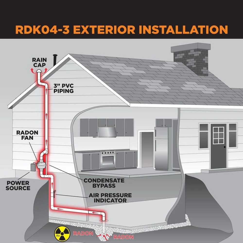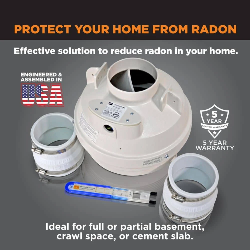 Active Soil Depressurization (ASD) is a radon mitigation system that uses fans to pull radon gas from beneath a home and vent it outside, which is exactly what the Suncourt Radon Mitigation Fan Kit is designed to do. The kit includes the 4 in. input/output fan, 2 white 4 in. to 3 in. rubber couplers, and an air pressure indicator. The thermal plastic housing is resistant to UV rays and rated for continual indoor/outdoor use. It is MET listed to UL & CSA Standards for USA & Canada and is proudly assembled in Iowa.