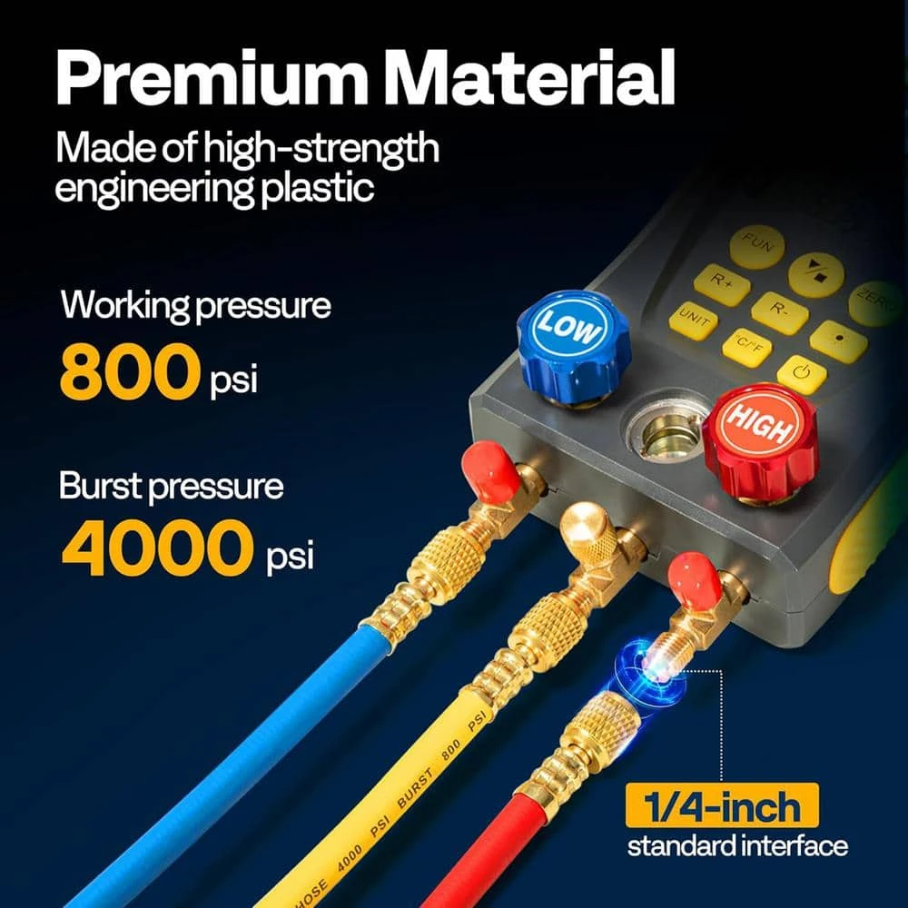 - HVAC system manifold gauge set boasts highly powerful features: dual pressure testing, dual temperature testing, digital readout, multi-unit switching, multi-mode functionality and built-in refrigerant database