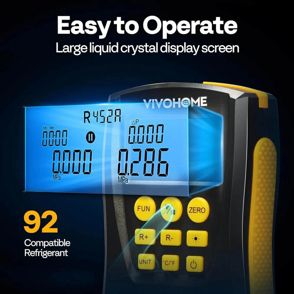 The electronic refrigerant group meter is an indispensable device for the installation, testing and upkeep of refrigeration systems. It boasts versatile functions and excellent performance, providing precise and accurate measurements. The LCD display and clear panel make the operation a breeze. The VIVOHOME Digital Refrigerant Gauge is an auxiliary instrument designed for the installation, testing and maintenance of refrigeration machinery such as air conditioners, refrigeration equipment and cold storage facilities.