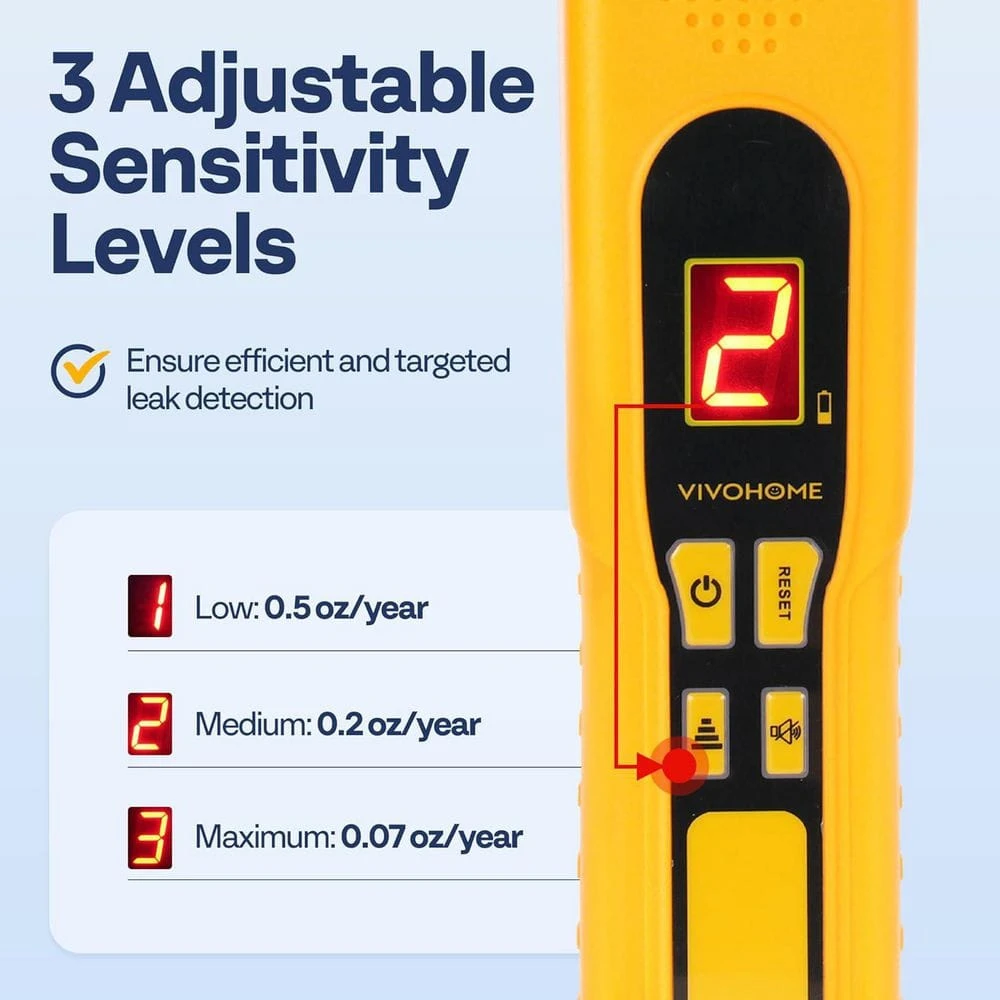 - VIVOHOME refrigerant leak detector has 3-adjustable sensitivity levels and a detection capability of up to 0.07 oz/year (2 g/year)