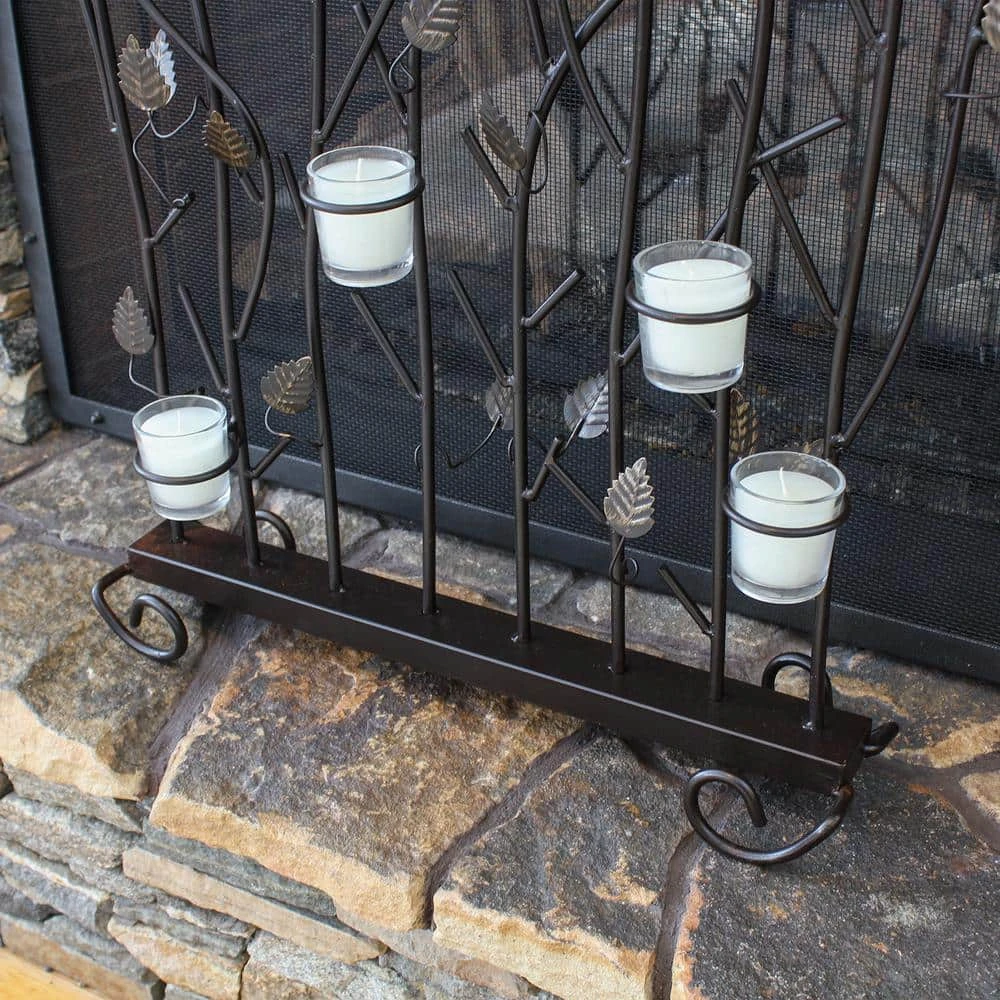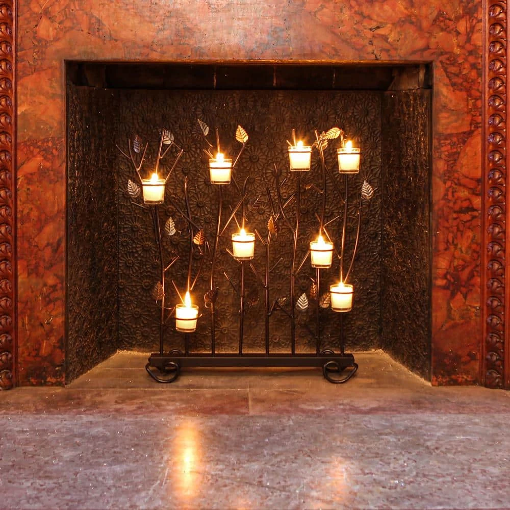 Let the fireplace remain the focal point of the room, even in the summer months with a summer screen. The Votive Rings Summer Screen features 8 rings designed to hold votive candles nestled in its bronze branches, the votive candles and gold-accented leaves will give the hearth a welcoming glow without the heat of a fire. This sculptural low-profile screen is made of wrought iron, ideal for adding a decorative accent that fits close to the hearth.