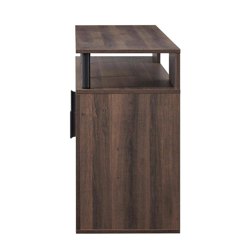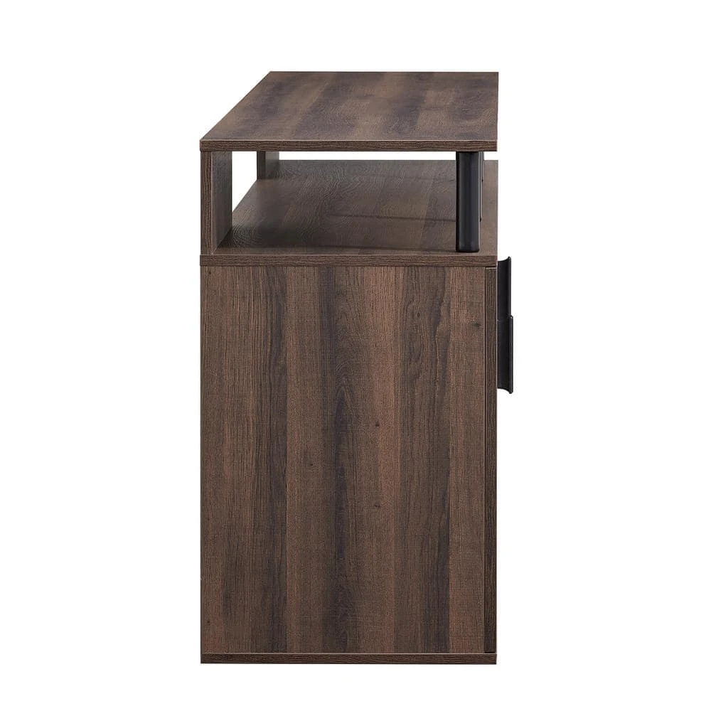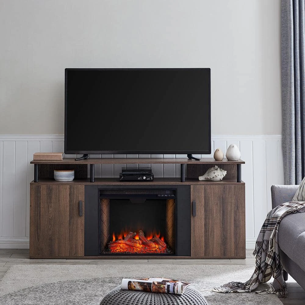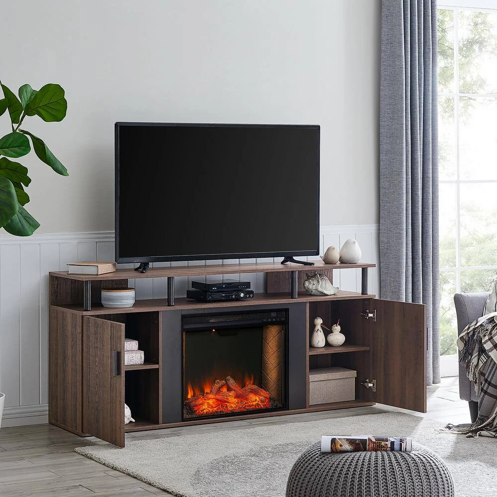 Cozy up to movie night with this fireplace entertainment center. 2 cabinets include shelves with cord control, tucking away electronics or blankets, while keeping wires tidy. Glowing faux fire logs add ambiance with flickering LED flames and lifelike embers, with or without heat. Voice-enabled Alexa technology allows for seamless control from anywhere in the room. Place your television on top or create a floating look by mounting it above. Enjoy family night in style when you gather around this fireplace media stand in your living area or game room.