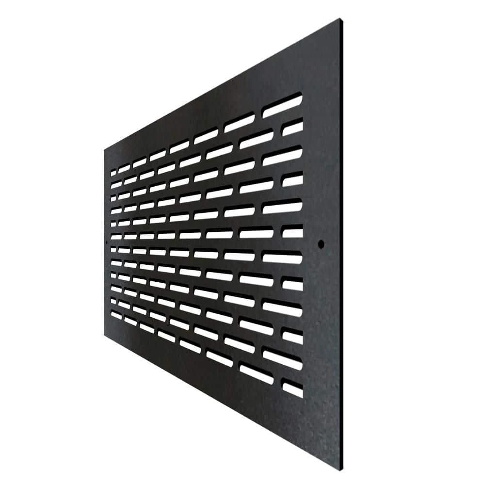 Our metal register covers help transform a rooms appearance with minimal effort. They are designed to sit on top of the floor and can be held down by screws. The registers are black painted, this finish gives a protective coating that will resist staining or corrosion. With a 1/16 in. thickness and a well-defined cut, these registers will not only last a lifetime but will also enhance the look of any room. For an even more enhanced look, the customer can route out their hardwood floor by 1/16 in. so the vent will sit flush with the floor as you can see in some pictures. We currently offer these registers in 4 different sizes. If another size is needed, we will work on your project.