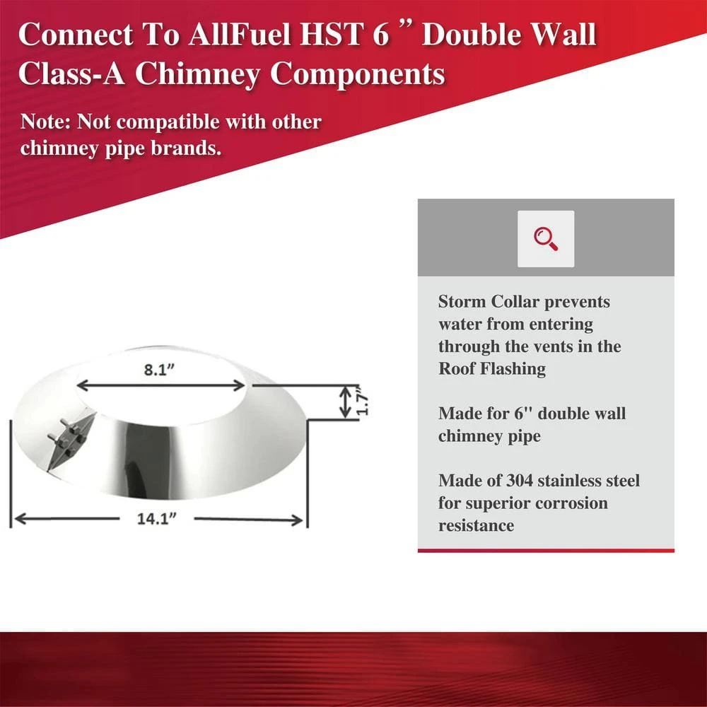 The storm collar works together with the Roof Flashing to provide a waterproof seal where the chimney passes through the roof. The storm collar is installed directly above the flashing and must be sealed to the chimney pipe using high-temperature silicone sealant (RTV 500°F or better), sold separately. Made of 304 stainless steel for superior corrosion protection.