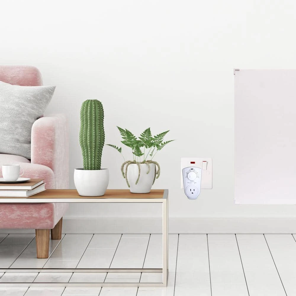 The Amaze-Heater Plug-In Thermostat provides the convenience of setting any of the Amaze-Heater wall panel convection heaters to maintain the desired room temperature. The thermostat is also a great addition for any type or brand of indoor heater or indoor wall air-conditioner unit. It will allow you to set the desired temperature, conserve energy and save money. The thermostat is an analog dial system for simplicity allowing you to set the desired temperature in Fahrenheit or Celsius. Simply select heat or cool setting on the rear of the unit, set to the desired temperature on the front dial, plug into the wall outlet and then plug in your heating or cooling appliance it’s that easy. The thermostat even includes an easy on and off switch on the front to turn both the thermostat and the appliance on or off.