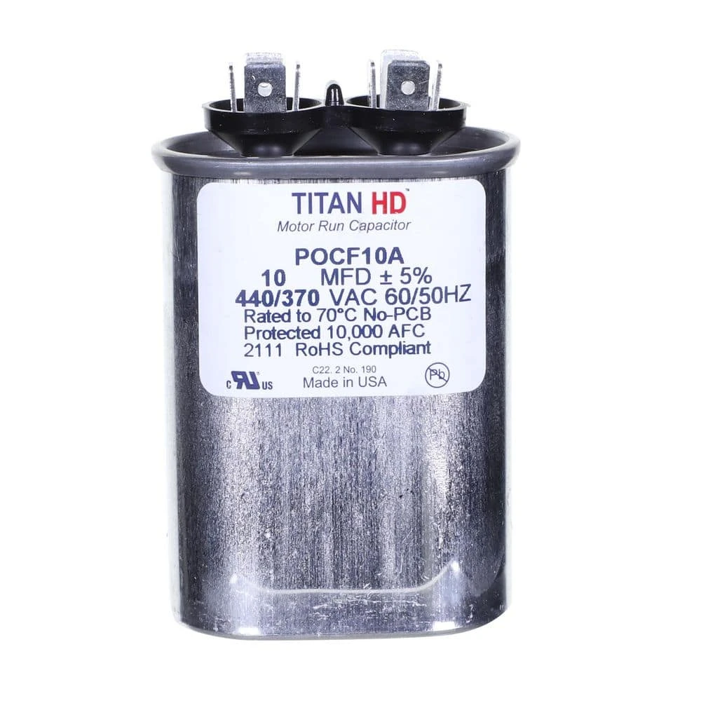 Titan HD 10 MFD 440/370-Volt is a professional grade dual voltage round motor run capacitor. Carry less inventory with this unit rated to service both 440-Volt and 370-Volt applications. Universal fit for all OEM units and 100% electrical tested.