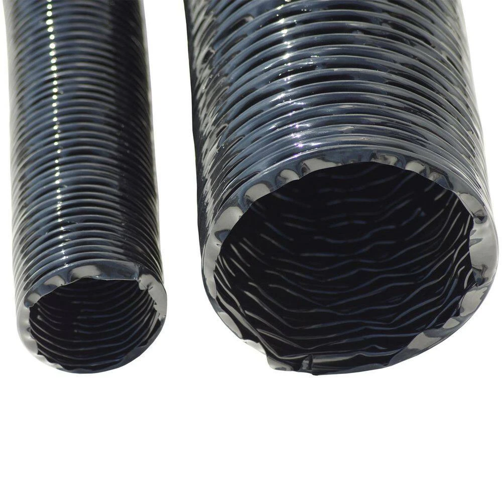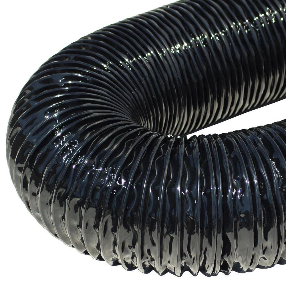 This flexible duct is available in popular dimeter sizes of 2 in., 2.5 in., 3 in., 4 in., 5 in., 6 in., 8 in., 10 in., and 12 in. It is available in lengths of either 12 ft. or 25 ft. in all dimeter sizes and the wall thickness of this hose is 0.015 in. This is a black polyurethane duct which combined maximum durability with that of flexibility. The XPU 708 – PU Flexible Duct can flex around tight bends and angles with ease and its durability allow it to be used in equipment that require the hose to be continuously flexed. This Polyurethane flex duct is ideal for use in applications that require the movement of bulk materials or abrasives. The hose is ideal for moving materials such as wood chips or wood by-products in woodworking facilities, road trash and debris when installed on parking lot sweeper trucks, agricultural byproducts, and it is also recommended for use on leaf collection machinery. Since polyurethane is highly resistant to many chemicals, this duct hose is also recommended for use in paint spray extraction and as a fume extraction hose in clean rooms or pharmaceutical applications.The XPU 708 – PU Flexible Duct has an all-black body with a wall that is reinforced by a spring steel wire helix. It possesses a superior rate of flexibility and compressibility. Across all ID sizes this ventilation hose has a compression ratio of 4 to 1, meaning that for example a 12 ft. hose can compress down to a 3 ft. section to allow for easier transportation and storage.